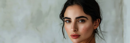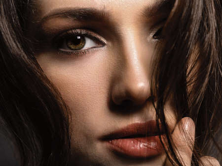 Beautiful woman with brown hair. Attractive model with brown eyes. Fashion model with a smokey makeup. Closeup portrait of a pretty woman looks at camera.