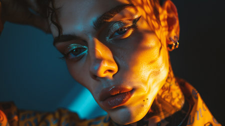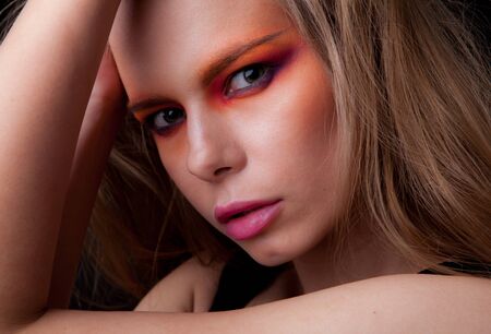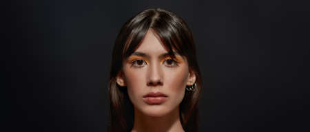 Beautiful face of young brunette woman with colorful bright makeup looking at camera isolated over black background