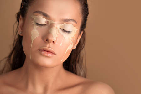 Art beauty close-up portrait of a beautiful model with curly hair. Creative make-up in the style of gold that drain tears from the eyes.