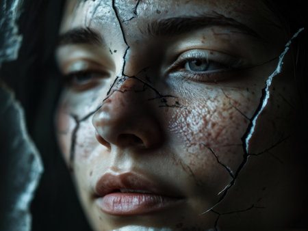 Close-up of the face of a young sad girl with cracked and dirty skin. The girl sighs and holds back tears. The concept of depression and anxiety disorders. Generated by AI.