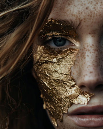 Close up portrait of a woman with freckles and golden leaf on her face, showcasing beauty and art