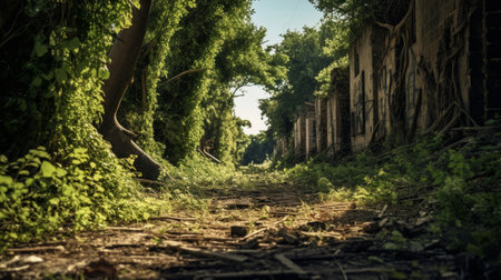 Roman road reclaimed by nature in a post-apocalyptic world overgrown with vegetation