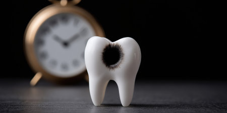 tooth model with exaggerated black hole, clock in background, metaphor for time lost