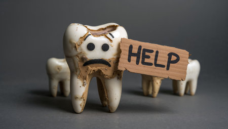 Cartoon teeth are on a gray background. One tooth looks sad and holds a sign that says help. Other teeth are in the background. The scene shows an expression of concern.