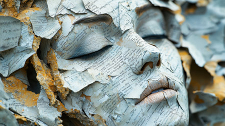 The artwork showcases a close-up of a human face intricately composed of weathered paper strips, representing a unique interpretation of identity and transformation.