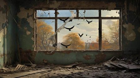 Burned house interior after fire, ruined building, disaster or war aftermath concept.