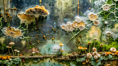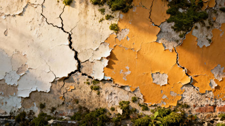 Grungy background of a ruined exterior wall with yellow ochre and off-white peeling paint layers, deep vertical fissures, and patches of vibrant green bryophyte moss lit by dramatic natural light.
