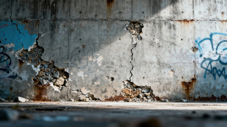 Collapsing concrete foundation wall showing severe structural failure and spalling, exposing the rocky core aggregate, brightly lit by sunlight and marked with rough blue street art tags.
