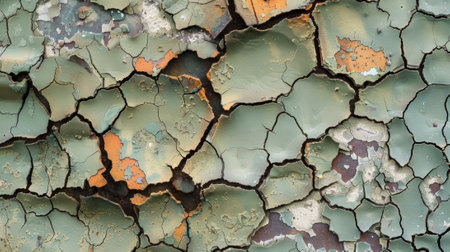 A closeup of flaking paint that has formed intricate patterns like a cracked mosaic on the surface of the worn and weathered machinery