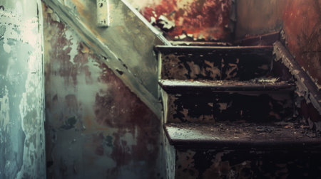 A captivating poster of a post-apocalyptic obstacle course race hangs on the wall of a desolate, abandoned factory The dark, rusty staircase and eerie atmosphere add depth to this intriguing image
