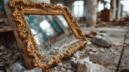 A broken, ornate antique mirror lies among rubble, its glass shattered and covered in dust, evoking a haunting and abandoned atmosphere.