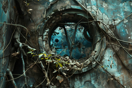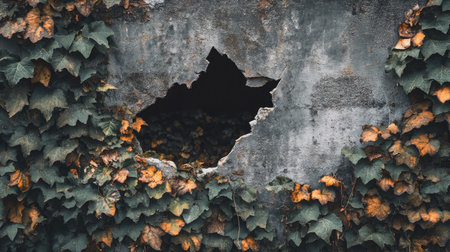A decayed grey wall featuring a massive irregular hole, overgrown plants spilling through, creating a contrast of urban decay and nature