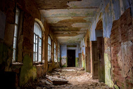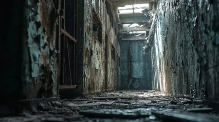 Long hallway of a decaying building, filled with fallen leaves and overgrown with vines. The building is weathered and has broken windows, and the roof is damaged.