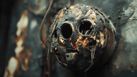 A close-up of a scorched light socket with burnt wire connections and soot marks