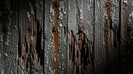 A detailed, close-up view of weathered wooden planks arranged vertically. The surface is characterized by peeling grey and white paint, revealing the aged wood grain beneath. Streaks of rust from exposed metal screws add a touch of color and texture. The overall impression is one of rustic decay and natural wear, with strong contrasts between light and shadow highlighting the intricate details.