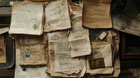 A captivating display of vintage letters and documents, showcasing the fading textures and memories preserved within aged paper. Perfect for historical and nostalgic themes.