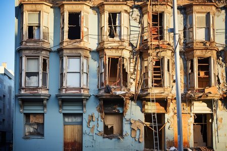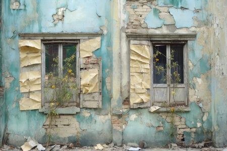broken windows and peeling paint on buildings, created with generative ai