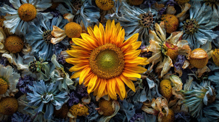 Bright sunflower surrounded by variety of dried flowers, showcasing vibrant colors and textures. contrast between fresh sunflower and muted tones of dried blooms creates striking visual appeal