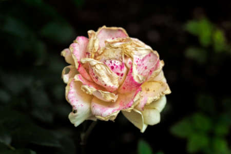 Nice pink withering rose at day on dark green background