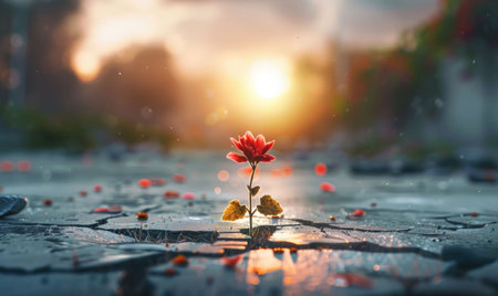 flower, sunset, nature, resilience, beauty, growth, hope, environment, blossom, landscape, outdoor, colorful, summer, sunlight, petals, earth, flora, vibrant, evolution, tranquility A solitary flowe