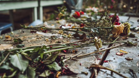 An AI generated illustration of a table with a dead bouquet of flowers and scattered petals