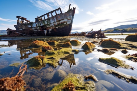 abandoned shipwreck near a disused dockyard, created with generative ai