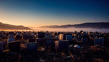 Endless field of discarded smartphones, TVs and appliances with giant sale price tags as tombstones, foggy morning light.