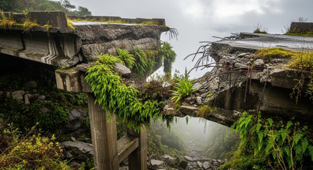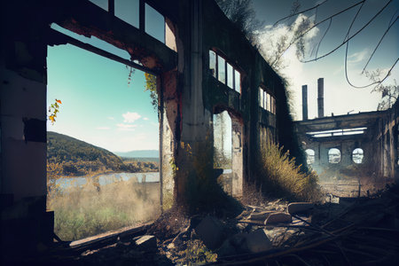 industrial ruin, with view of the surrounding landscape and natural elements, created with generative ai