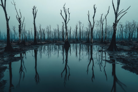 An oil lake reflects the surrounding barren trees under a glowy sky, creating an unsettling, otherworldly atmosphere in a lifeless landscape.