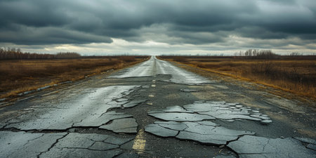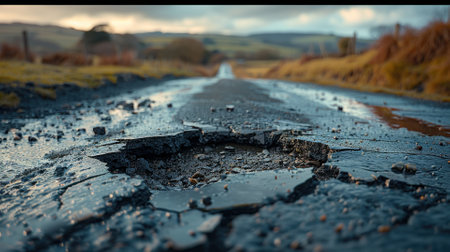 Damaged asphalt street with deep cracks and crumbling edges, shot from a low angle