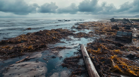 This image captures a coastal scene featuring seaweed and driftwood scattered along the shoreline. A moody atmosphere prevails with overcast skies and gentle waves.