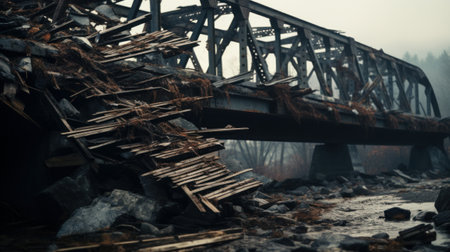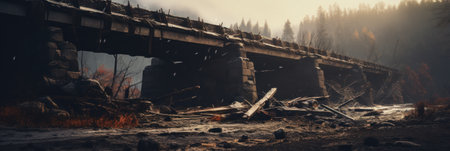Dark showing multiple collapsed and damaged bridges over a dark river in a desolate landscape under an overcast sky. resolution use.