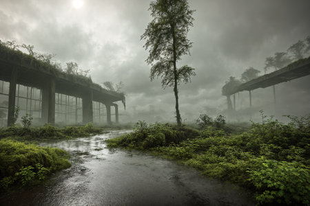 Post-apocalyptic wasteland, abandoned buildings, overgrown vegetation, remnants of society, desolation, eerie atmosphere