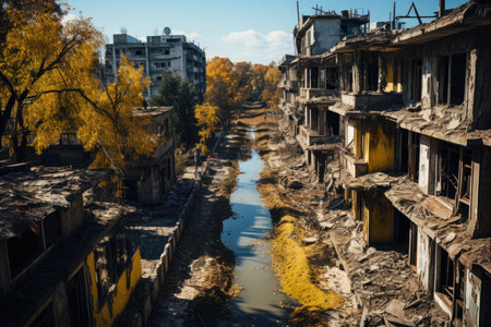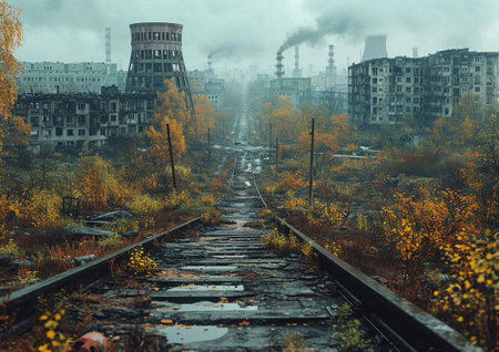 Abandoned city destroyed by nuclear power plant.Major disaster and apocalipsys.AI Generative.