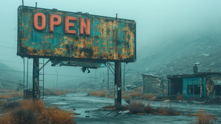 Vintage Rusty Weathered Grunge Metal Open Sign extreme closeup. Generative AI