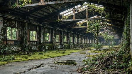Abandoned factory overgrown by vines, symbolizing trade shifts, factories can shut down. old industry concept.