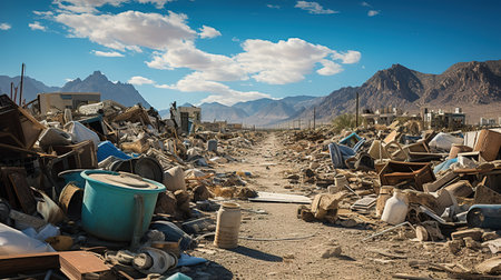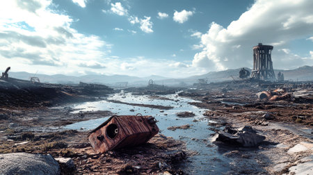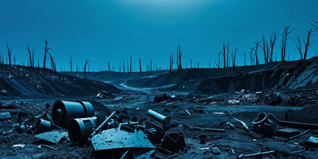 AI Generated. Polluted landscape near mining operation with debris and dark soil