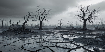 Post-only desolation Run away replace homes, trees include, gray sky reflects sadness., generative AI
