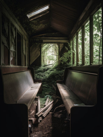 A disused chapel the pews overturned and stained with age lies abandoned and forgotten in a forgotten corner of the forest. Gothic art. AI generation
