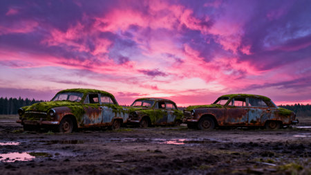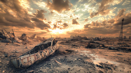 In a desolate landscape, remnants of civilization lie scattered under a stunning sunset, highlighting the struggle for survival in an unforgiving world.