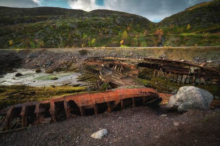Abandoned ships cemetery at low tide near Teriberka village in Murmansk Region. Kola peninsula, Northern Russia