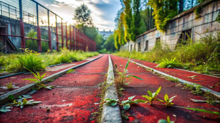 This evocative photograph captures the haunting beauty of an abandoned stadium, a testament to time's relentless march. The once-vibrant red running track, now etched with the passage of seasons and speckled with graffiti, speaks volumes about the site's forgotten glory. Weathered concrete, rusted metal, and overgrown vegetation intertwine to create a powerful visual narrative of urban decay and the reclaiming power of nature. The decaying athletics facility, a silent observer of forgotten games and cheering crowds, offers a poignant glimpse into a bygone era. This urban exploration image showcases the raw industrial aesthetic of the crumbling structure, juxtaposed with the vibrant, yet faded, red of the track. The stadium's isolation and the profound sense of abandonment are palpable, as if the echoes of past athletic endeavors still linger in the air. A stunning array of colors, from the rusty hues of the decaying metal to the vibrant bursts of graffiti, paint a picture of a place both forgotten and strangely compelling. The photograph's composition captures the stadium's intricate details, from the weathered texture of the concrete to the subtle nuances of the overgrown vegetation, creating a powerful visual statement about the interplay between human creation and the restorative forces of nature. We are transported to a post-apocalyptic world, where the remnants of a bygone era exist in harmony with the present. The image is a potent meditation on the transient nature of things, a testament to the beauty found in decay, and a captivating exploration of urban exploration photography. The red track stands as a stark reminder of an era long past, a silent observer of forgotten games and cheering crowds.