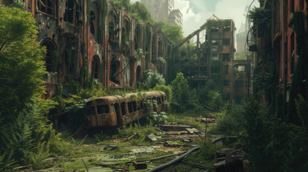 AI Generated. Crumbling Futuristic Cityscape with Overgrown Vegetation in Post Apocalyptic Landscape