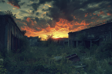 A fiery sunset looms over the ruins of an abandoned industrial factory, where nature slowly encroaches upon man-made structures. Resplendent.