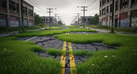 AI Generated. Desolate urban landscape with cracked earth and abandoned structures at dusk