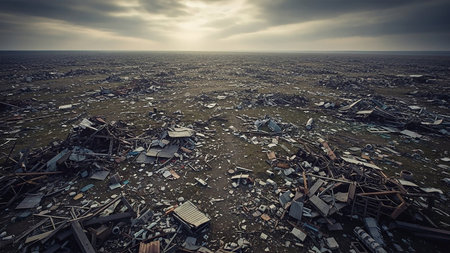 A desolate landscape covered in piles of debris and scattered wreckage under a cloudy sky, depicting a scene of destruction.