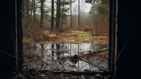 an abandoned room with broken windows and waterlogged wooden floors, capturing the essence of atmospheric landscapes. this photograph combines elements of wildlife photography, american tonalist art, traditional british landscapes, forestpunk aesthetics, and showcases a low depth of field to highlight the organic formations within the scene. ai generated