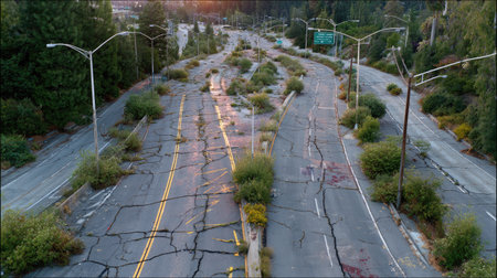 An aerial perspective shows a highway overtaken by plant life. The asphalt road surface is cracked and aged with bushes growing in the center. The composition is symmetrical with light poles present. It could be used in projects focusing on environmental change or post-apocalyptic themes.