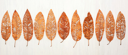 A captivating arrangement of dry leaves on a clean white surface, highlighting the intricate textures and colors of nature in a minimalist design.