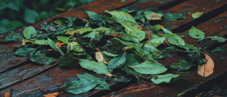 Herbal tea leaves spread across a rustic wooden surface create a calming atmosphere
